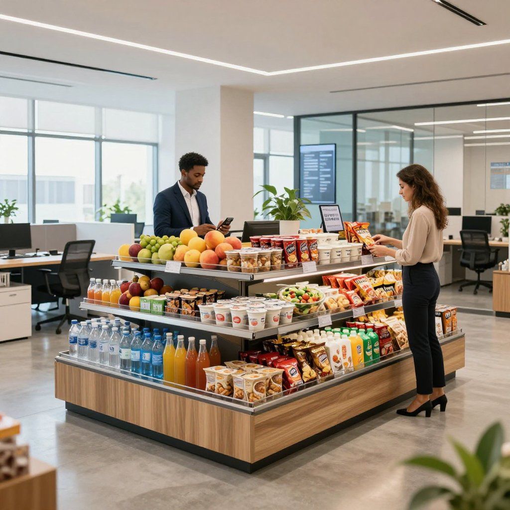 A photo-realistic image showing a modern vending machine in a bright office break room with employees selecting snacks and beverages, highlighting convenience and engagement.